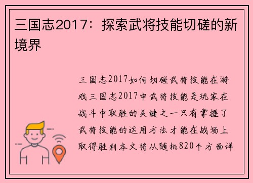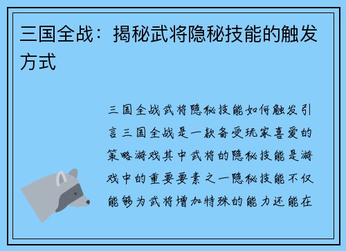 PSV三国志13如何操作 引言: PSV三国志13是一款非常经典的策略游戏,玩家扮演一位三国时期的领导者,通过政治、外交、战争等手段来统一中国。本文将从随机的8个方面详细阐述如何操作这款游戏,帮助玩家...